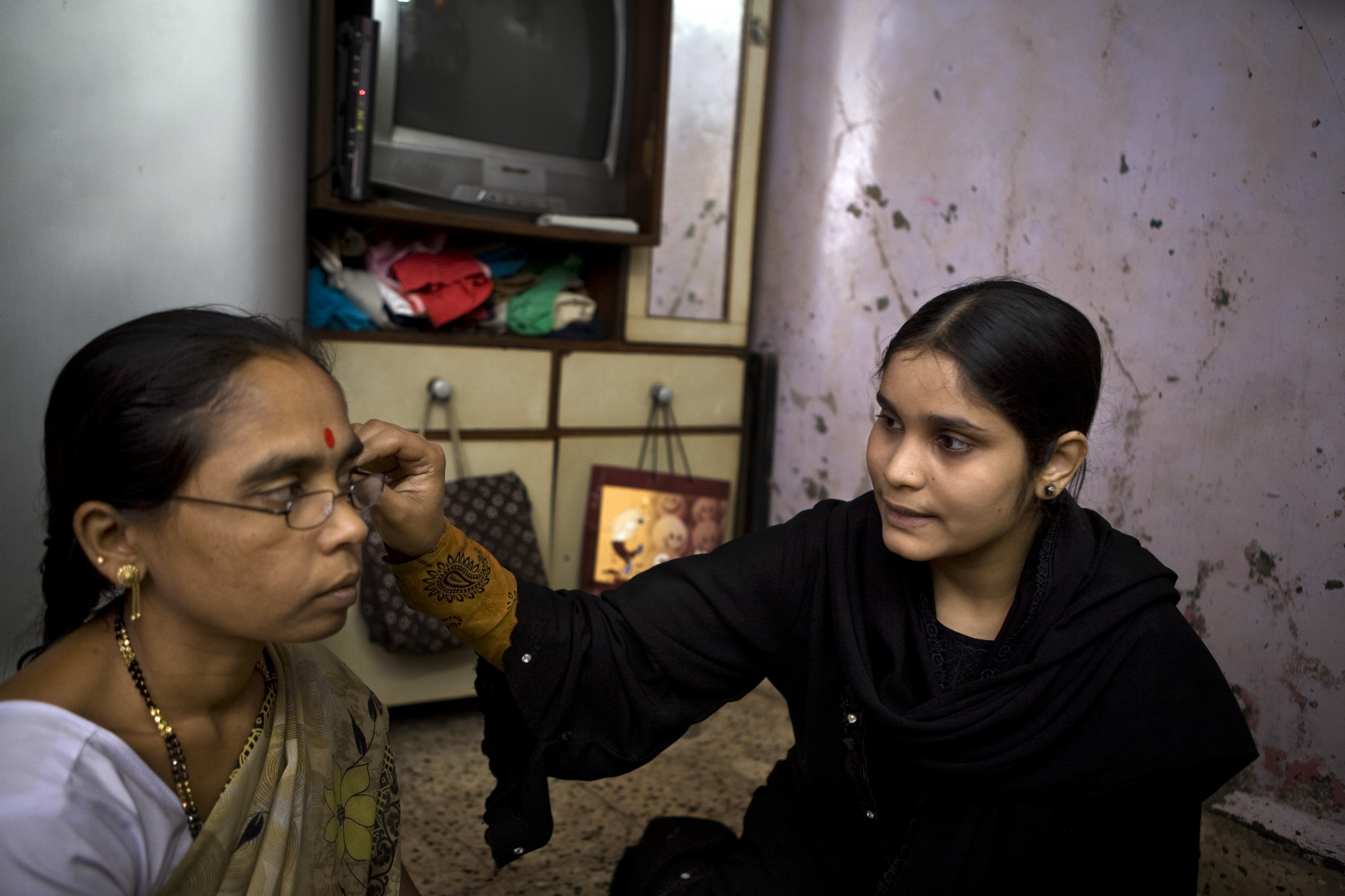 Hirabai Bayle, living in the Dharavi slum in Mumbai, India, shares a tiny home with her mother, teenage son and four sisters. Her husband left her and her son and now Hirabai earns £13 a month to support herself and her son, selling bananas and stitching gloves in a workshop. 20-year-old lady health worker, Jeba Ansari, visited Hirabai and diagnosed her as long sighted. By providing her with glasses, Jeba ensured that Hirabai could continue to work and remain financially independent.