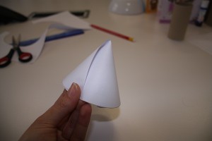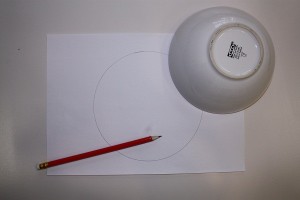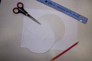 Use the kitchen bowl to draw a circle on a sheet of paper. Find the exact centre of the circumference at C (-a/2 ;-b/2). Just kidding… roughly sketch what looks to you like the centre and draw a line from that point to the circumference. Then cut through and roll the two ends on top of each other with your fingers. Staple to keep the two pieces together.