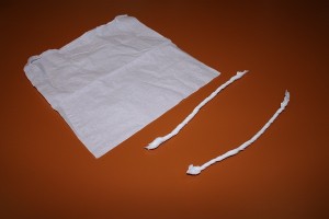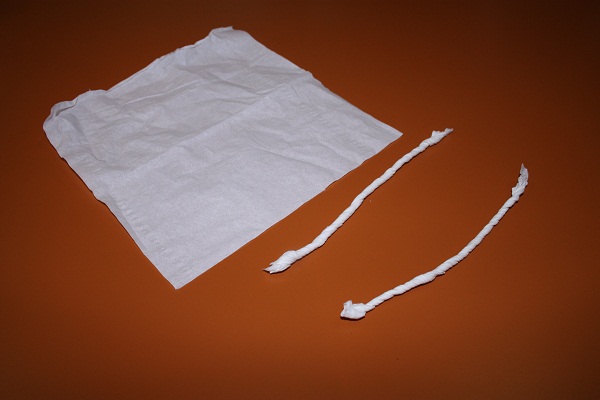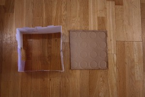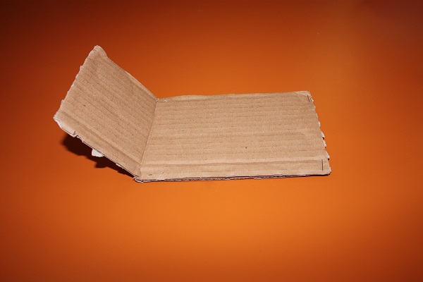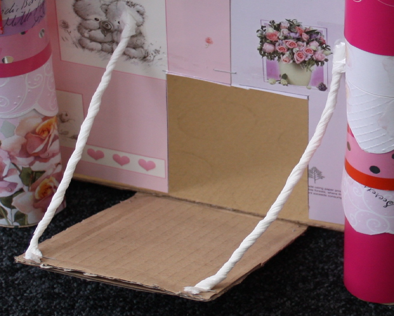 Just tape the piece of cardboard to the floor. Then cut the tissue in two parts and twist the two pieces to create two small strings. Tape one extremity of the strings to the bridge, and the other one to the wall, as shown below.