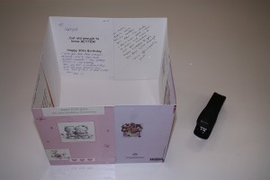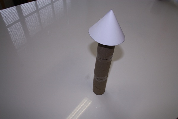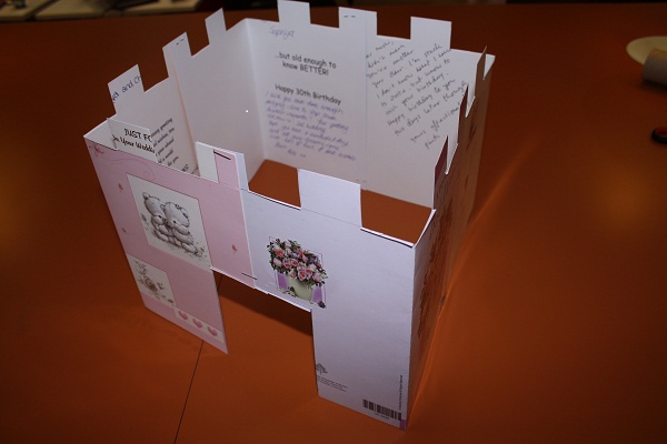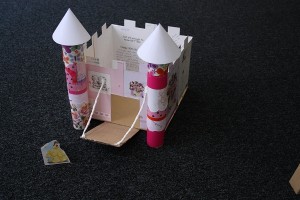 Tape the three toilet paper insides together (or use two kitchen roll insides instead). Then top the turret with a nice sloping roof (more on this below, at point 6). Once you’ve done this twice, you can decorate the turrets using pieces of old greeting cards.
