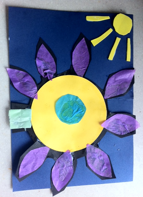 I was showing my daughter how to make stained glass windows using black paper with tissue behind. She was having none of it and instead made this flower picture (I merely helped with a little circle cutting.) She simply used foam and tissue and glue. It took her ages to decide on her colours. It was very early in the morning and we had almost a whole hour together quietly contemplating this picture.