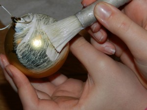 You simply put glue on in a fairly even layer on the bauble, in small sections. Place the material you want to cover the bauble with and then brush more glue on top.