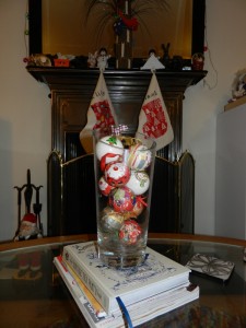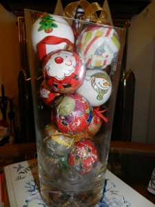 So we then exchanged the twine that was on the bauble for more brightly coloured ribbon, and filled a vase with the Little Miss’s creations!